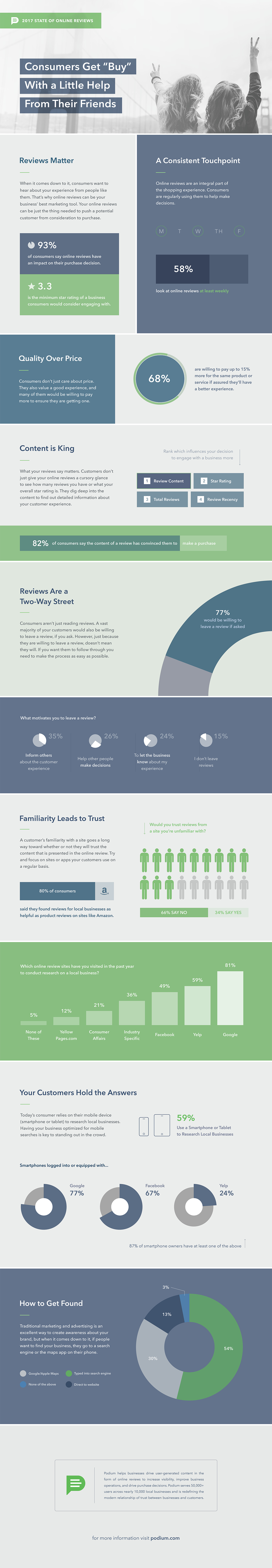 The importance of positive reviews is hard to overstate. Around 98% of consumers read online reviews to evaluate local businesses—particularly on Google, Yelp, and Facebook—and most consumers won’t engage with any business with a star rating below 3.3.